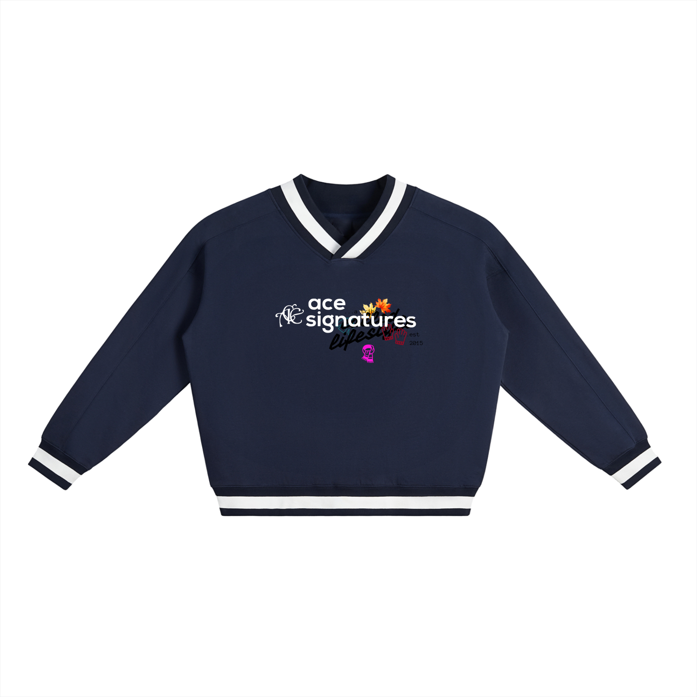 Capture a timeless collegiate vibe with the “ace Signatures Varsity Jacket.” This classic piece features a snap-button front, contrast cream-colored sleeves, and sporty striped ribbing on the collar, cuffs, and hem. The chest is detailed with “ace Signatures” script and the colorful “…a tribe called lifestyle” graphic. The back makes a bold statement with a large, red outlined “12,” “SIGNATURES” text, and scattered graphic stars.